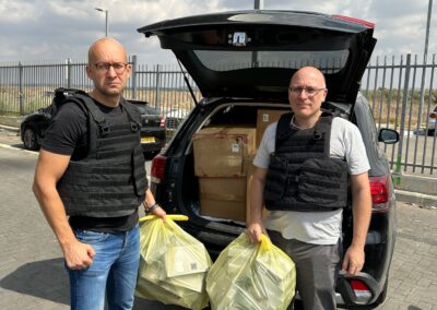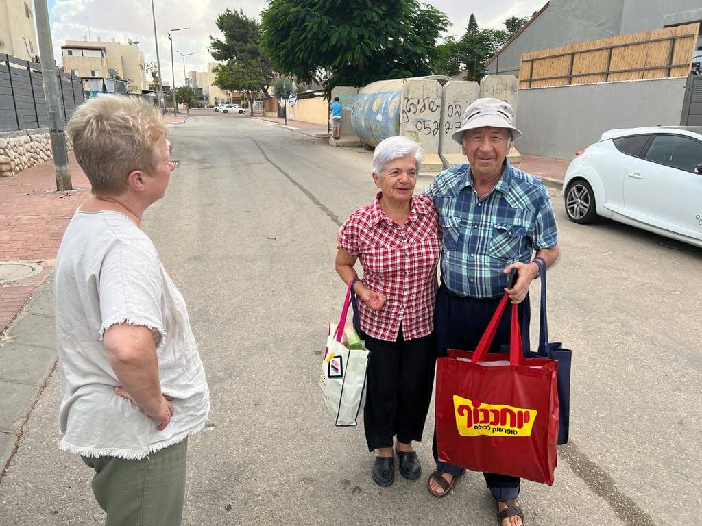 Yesterday, we delivered food packages to older people from Sderot who are being evacuated. We also went to the city of Ofakim, whose residents experienced tough days; terrorists entered the town, many people died, and residents are under constant rocket fire. Six people from the Holocaust survivors‘ club with whom we work were killed on the first day of the attack!